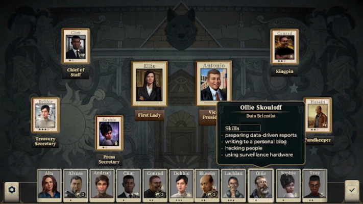 За да оцелеете и доминирате, ще създадете екип от верни специалисти – от хакери и лобисти до оперативни агенти с различни умения. Изпращайте ги на критични мисии, които могат да бъдат разрешени както по законни, така и по... по-нестандартни начини. Всеки избор, който правите, променя завладяващия интерактивен разказ, който се развива пред вас. Ще приключите ли мандата си триумфално, диктувайки собствените си условия, или ще се окажете просто пионка в по-голяма, по-сложна игра? Крайната ви цел е ясна: променете структурата на Конституцията на САЩ. Убеждавайте, изнудвайте, подкупвайте и тормозете политическата система, за да си осигурите доживотен имунитет. Управлявайте страната като истински мафиотски бос, създавайки кабинет в сянка, който ще бъде едновременно уважаван и безкрайно страшен в световен мащаб. Налични езици: EN/RU.