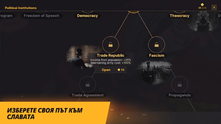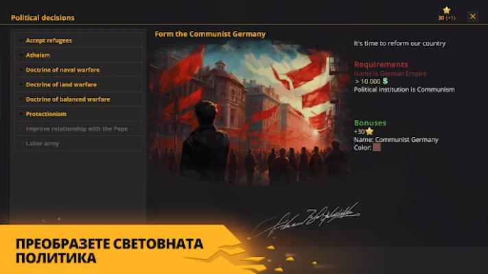 Не просто воювайте – управлявайте с мъдрост. Изберете един от множеството политически режими и вземайте критични решения, които определят идеологията и бъдещето на вашата нация. Контролирайте щателно всяка провинция на вашата държава, оптимизирайки я за икономически пробив, научни иновации или военна продукция. Warnament предлага дълбочина, която ще предизвика дори най-опитните стратези, докато изграждате своята непоклатима империя и променяте хода на историята.